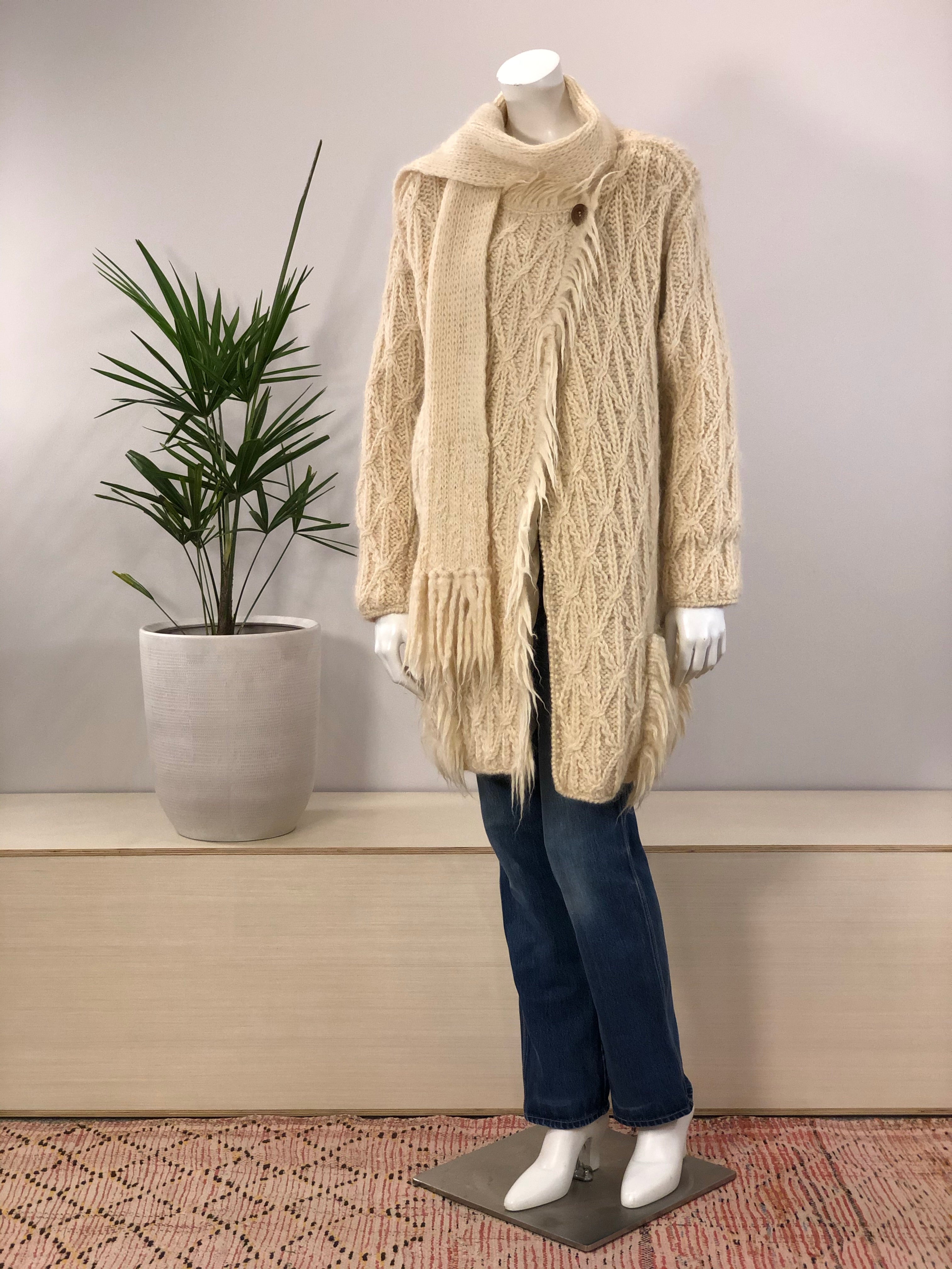 Vintage Hand Knit Fringed Wool Sweater Coat With Attached Scarf 70s Hong Kong Vintage