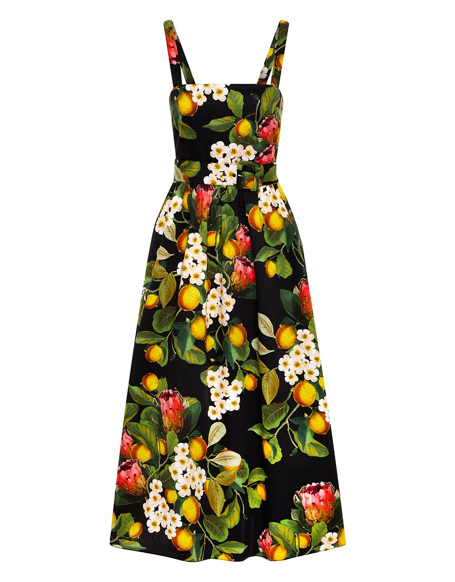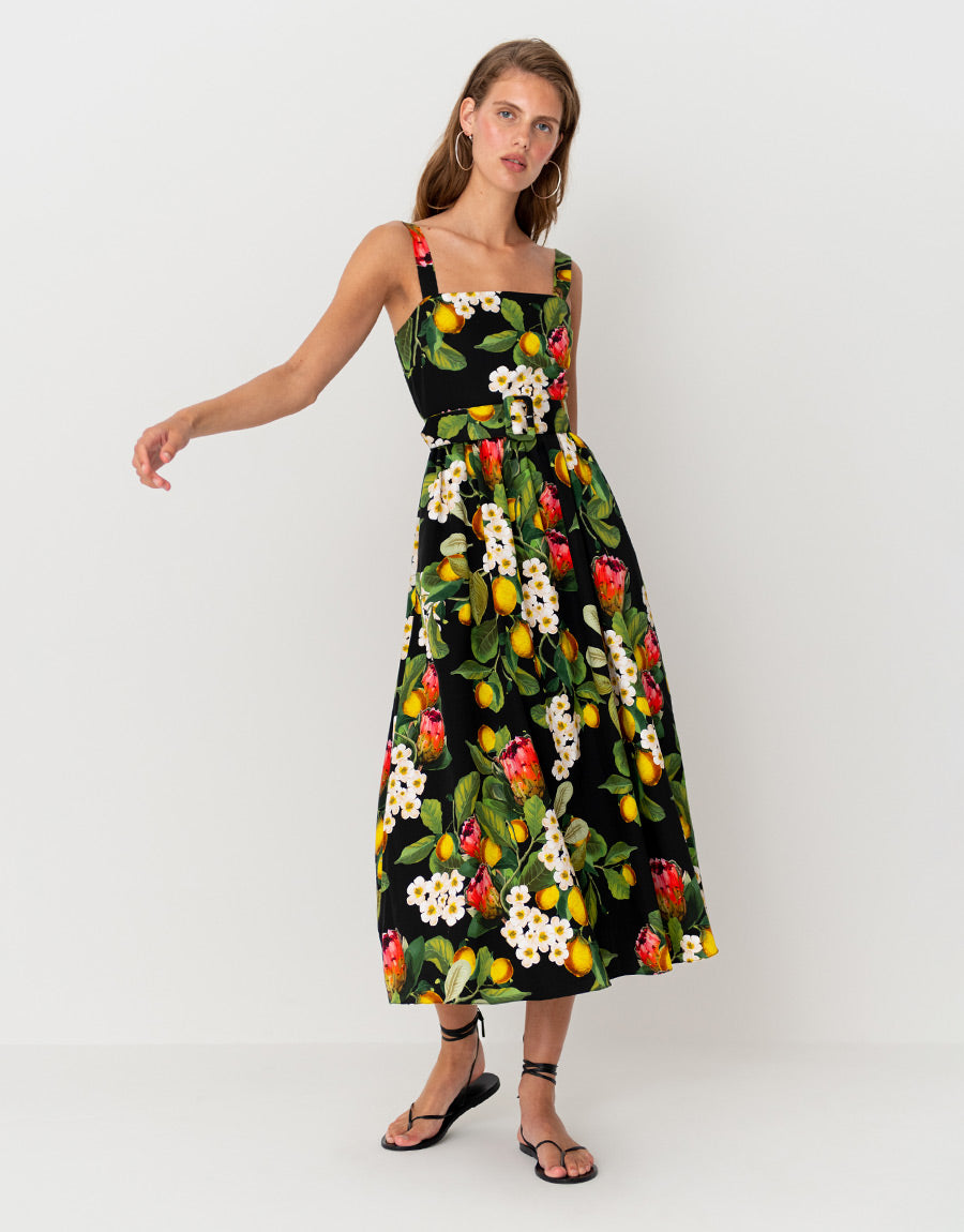 Ninet Cotton Midi Dress Lemon Bouquet Black Borgo De Nor